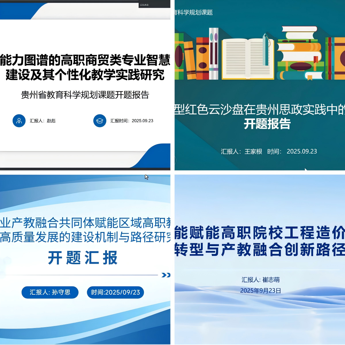 为扎实推进教育科学研究工作,提升课题研究质量,2025年9月23日晚,贵州财经职业学院科学研究中心通过线上会议形式,成功召开了“2025年贵州省教育科学规划课题”开题评审会。会议特邀三位省内知名专家组成评审组,对学院本年度的四项贵州省教育科学规划课题进行开题评审。各课题负责人、课题组成员参加会议,会议由科学研究中心主任曾维红主持